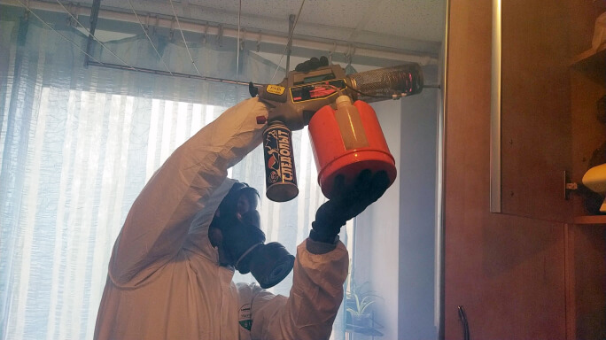 Фумигация – это более радикальный метод, который предполагает заполнение пространства газом, который проникает в самые труднодоступные места. Процедура этого метода требует временного покидания помещений людьми и животными на время обработки.